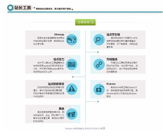 站長可以通過工具區(qū)提供的死鏈推送、站點索引量查詢、站點抓取報錯查詢、robots工具、站點壓力反饋和網(wǎng)站安全監(jiān)測等功能,減輕網(wǎng)站服務(wù)器壓力,提升網(wǎng)頁抓取效率和質(zhì)量,減少網(wǎng)站安全隱患,從而實現(xiàn)網(wǎng)站的精細化運營。資料區(qū)提供了搜索優(yōu)化案例、工具使用說明、網(wǎng)站運營經(jīng)驗文檔,幫助站長汲取網(wǎng)站運營經(jīng)驗、夯實理論基礎(chǔ);站長社區(qū)的則是站長間溝通和分享的平臺,既會定期組織交流活動和分享討論,,有利于站長們?nèi)¢L補短提升網(wǎng)站運作技巧,解決站長面臨的典型問題。